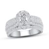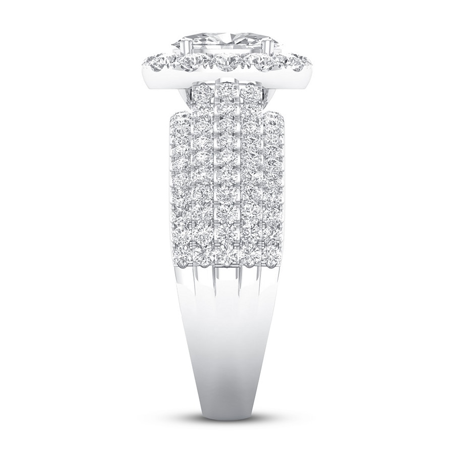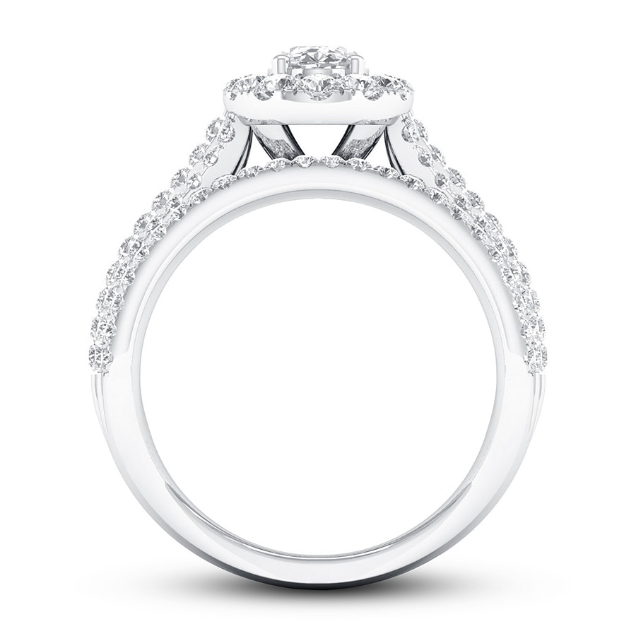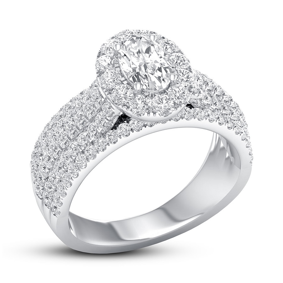 This thrilling engagement ring captures your love with independently certified diamonds. A 1/2-carat oval diamond shines at the center, while brilliant round diamonds create a halo and enhance the generous 14K white gold band. The ring has a total diamond weight of 1-3/8 carats, and the center stone is laser-inscribed with a unique Gemscribe? serial number.