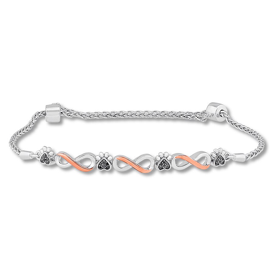 This fabulous bolo bracelet for her captures the eternal love for a pet with paw prints and infinity signs. Black diamonds accent the paw prints, and curves of 10K rose gold embellish the infinity signs for splashes of color. The sterling silver bracelet has a total diamond weight of 1/10 carat. The bolo clasps slide along the wheat chain to adjust the bracelet up to 9.5 inches in length. Black diamonds are treated to permanently create the intense black color.