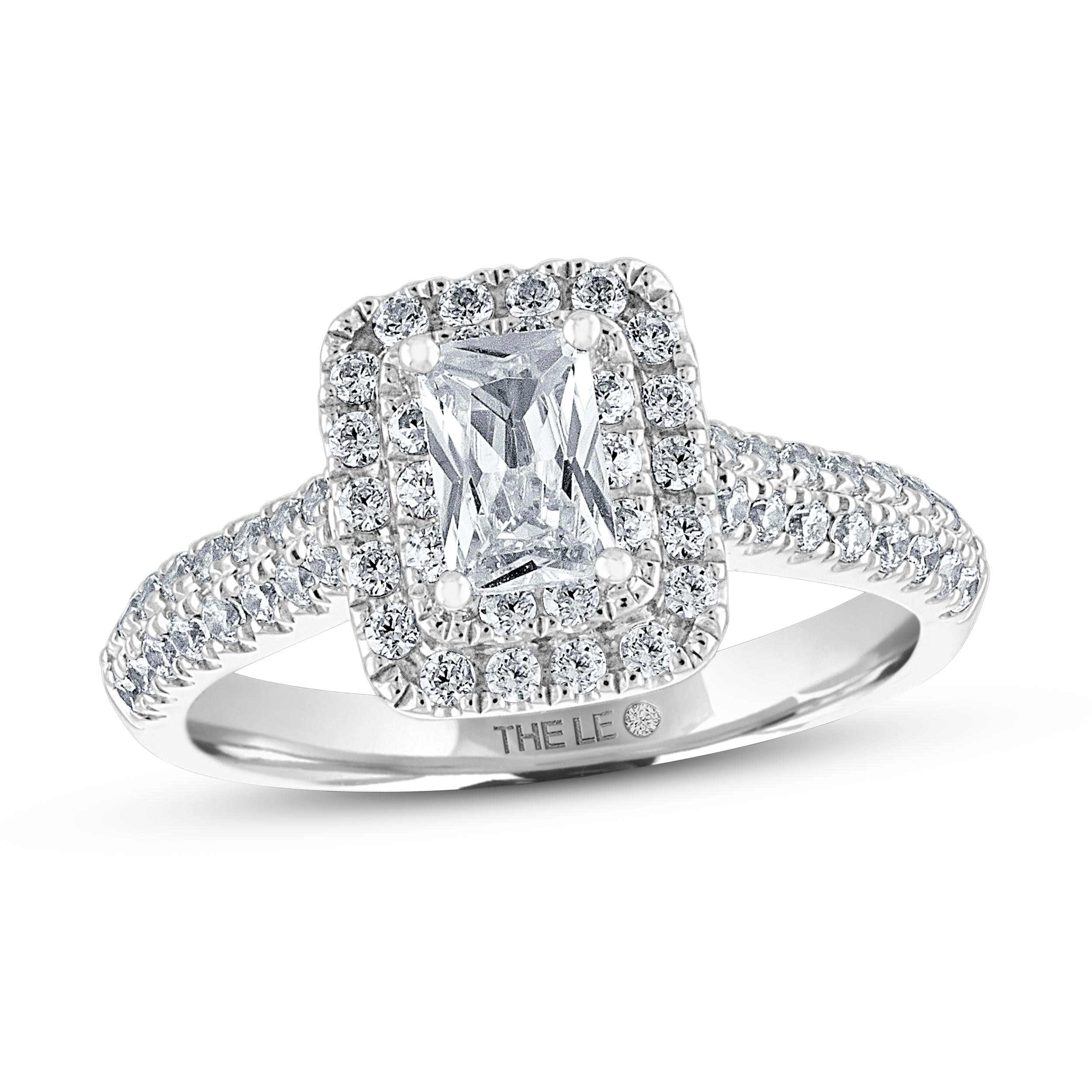 An elegant independently certified 1 carat emerald-cut diamond is the highlight of this classic Leo Diamond engagement ring. Shimmering round diamonds halo the center diamond and line the 14K white gold band to bring the ring
