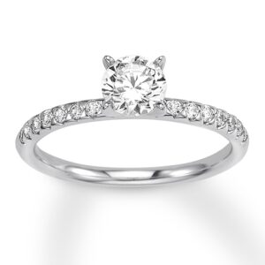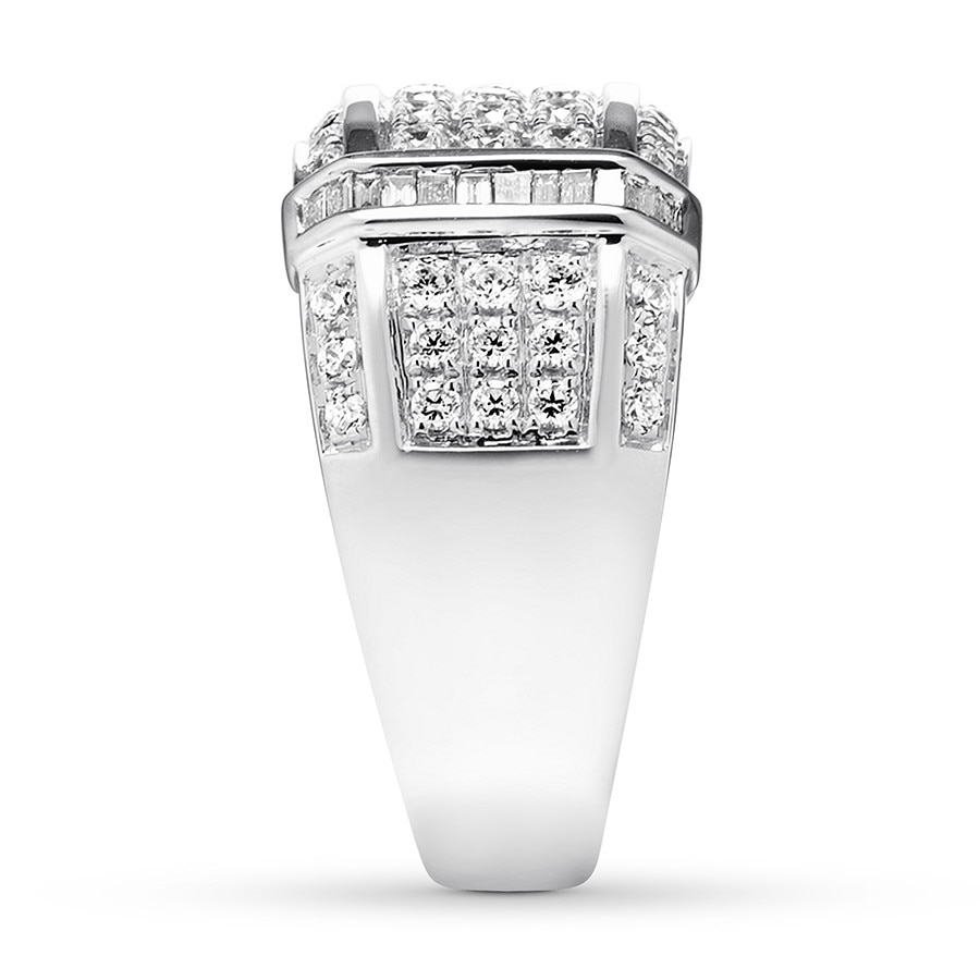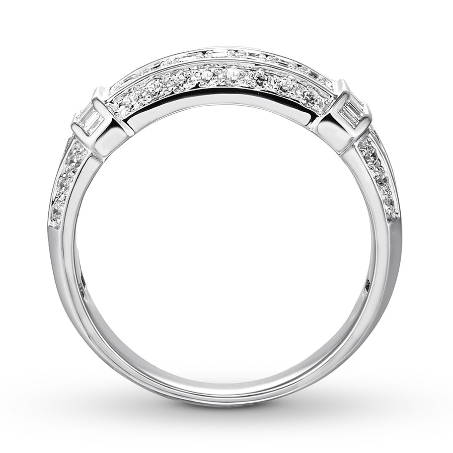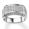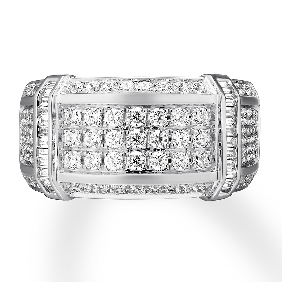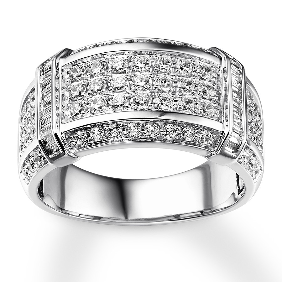 Three sparkling rows of round diamonds adorn the center of this distinguished men's band, while vertical rows of baguette diamonds provide contrasting brilliance. More diamonds edge the band to bring the total diamond weight to 1 1/2 carats. The ring is styled in high-polish 10K white gold.