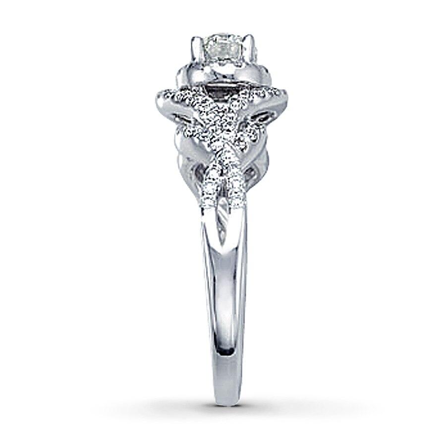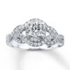 A captivating round diamond in this dazzling engagement ring will take her breath away. Additional pave diamonds in romantic twists of 14K white gold complete the look. This fine jewelry ring has a total diamond weight of 1 carat. Available online while supplies last. Previously Owned Jewelry is not eligible for in-store pickup. Previously Owned Jewelry may only be shipped either to your home address or to an alternate address.