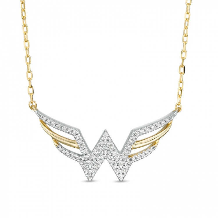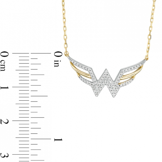 In fiercest style, this diamond necklace from the Wonder Woman? Collection translates epic heroism into modern fashion. Crafted in warm 10K gold, this look showcases diamond-lined ribbons sculpted into the classic “WW” logo at the center. Polished ribbons complete the triple-row wing design. Radiant with 1/8 ct. t.w. of diamonds and a brilliant buffed luster, this symbol suspends centered along an 18.0-inch cable chain, with an additional closure ring at 16.0 inches, that secures with a spring-ring clasp. The Wonder Woman? Collection of fine jewelry at Zales is inspired by one of the most beloved and iconic DC? Super Heroes of all time. Embodying strength and grace, Wonder Woman? is a modern-day warrior. This exclusive fine jewelry collection inspires you to wear your strength, confidence and power.